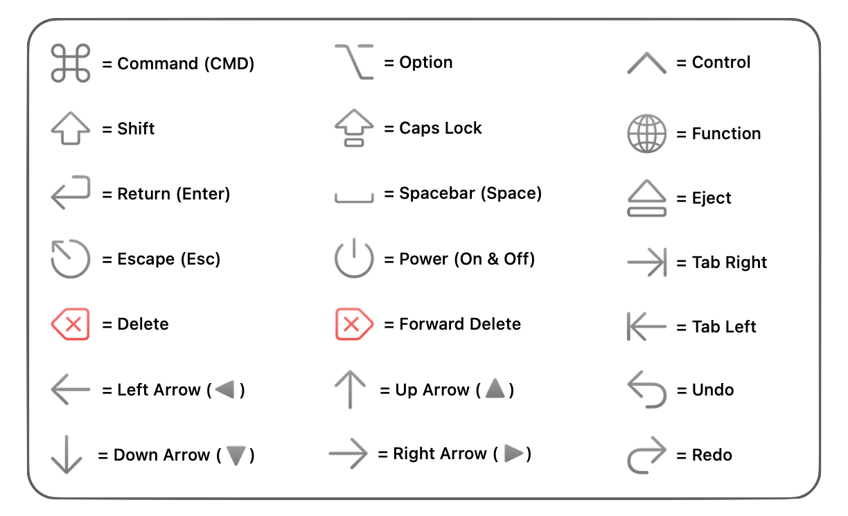 Mac keyboard shortcut symbols legend showing Command, Option, Shift, Control, and Function keys